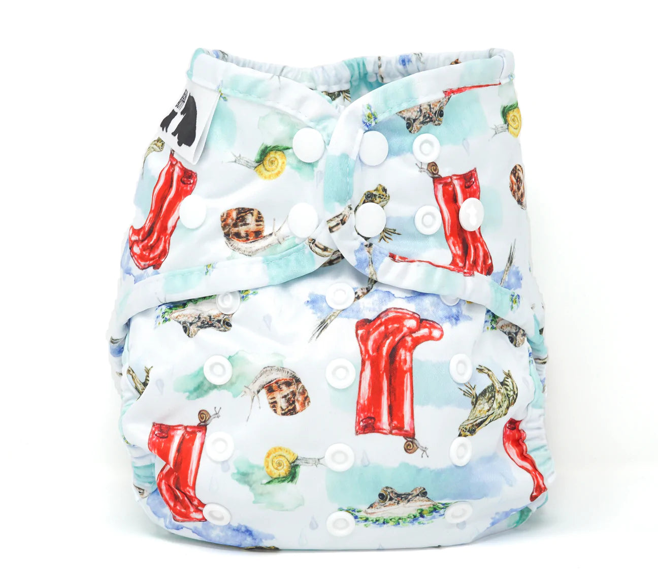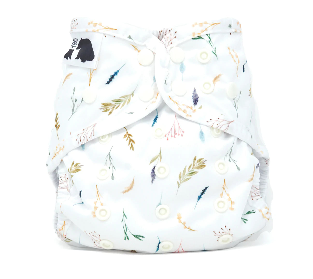 Bear Bott All in One nappies feature a double row of waist poppers and crossover waist poppers for smaller babies.